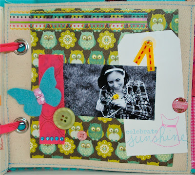 I made this a few months ago with a Michelle Hill kit. I can't remember which month it was (only because i have a box full of her kits... yes, I'm obsessed.) but I do know it was a just a few months ago. The book is a Donna Downey. It has canvas pages and I replaced the ties (they tie all the pages together) with fabric strips from the MH kit. The pictures are of my niece. Her friend took them just for fun. Also, just a little FYI, i never used a paper trimmer. Everything is cut by hand. It's one of my favorite things to do...